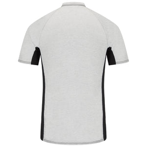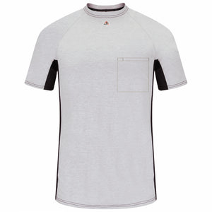 Self-fabric crew neck collar. Concealed chest pocket and pencil stall . Tagless. Raglan sleeves. Contrast mesh side seam gusset. Heat seal Bulwark triangle centered at neck to show wearer has on FR undergarment.