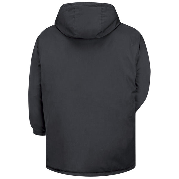 Pocket: Two concealed zippered pockets at waist. Two lower insulated bellow w/concealed snap flap. Zippered pocket on left bicep. Pencil pocket underside of storm flap.