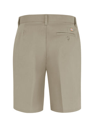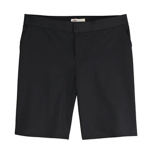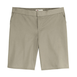 Dickies' Women's Flat Front Short sits slightly below the waist and has a stretch interlining in the waistband for expanded comfort. It features wrinkle resistant, StayDark® and stain-release technology. The short is manufactured with a right back-welt pocket with button closures and a hook-and-eye front closure.